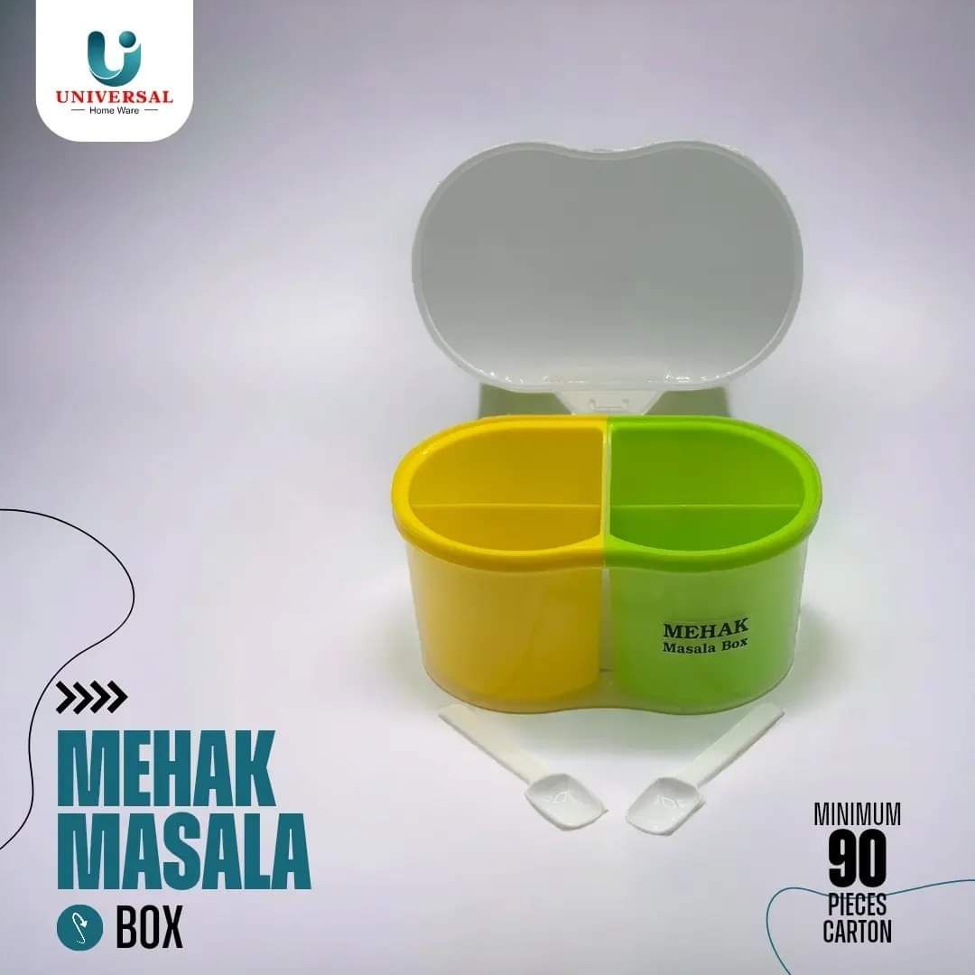 "Mehak Masala Box," a multipurpose plastic container designed for kitchen spice storage.
